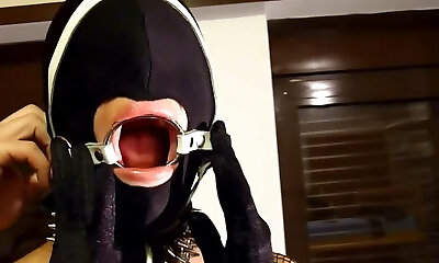 Asain giving a gasping blowjob using O-Ring